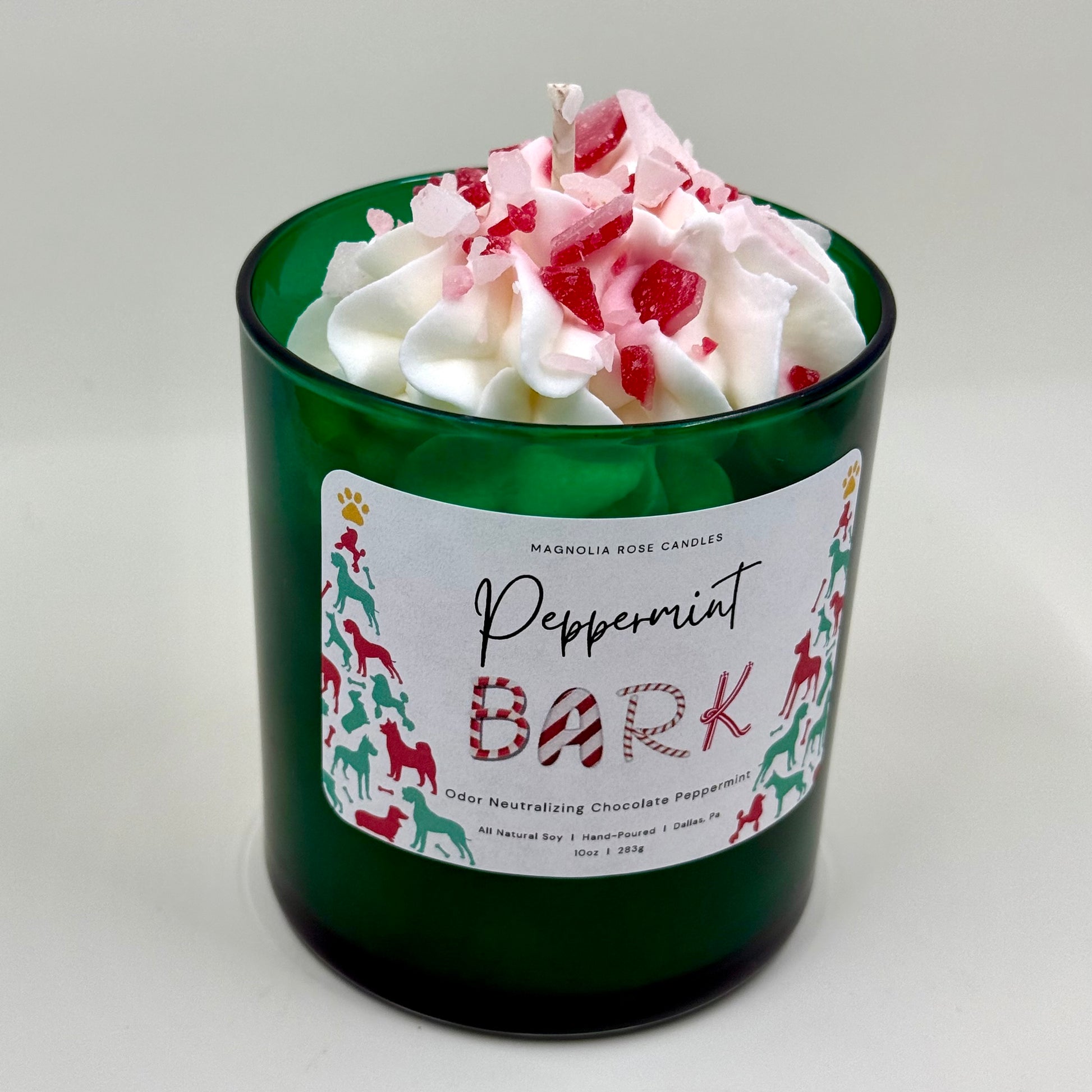 Inspired by the holiday’s favorite sweet treat, this 10oz soy candle is topped with wax whip and crumbled wax peppermint bark for a festive touch. Odor-neutralizing and perfect for pet-loving homes, it blends cool peppermint, rich chocolate, creamy vanilla, and coconut milk - bringing the nostalgic scent of classic holiday candy home.
